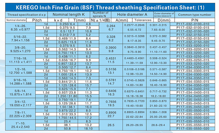 KEREGO Inch Fine Grain (BSF) Thread sheathing Specification Sheet: (1)