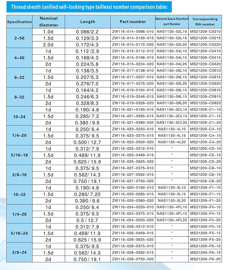 Thread sheath (unified self-locking type tailless) number comparison table: