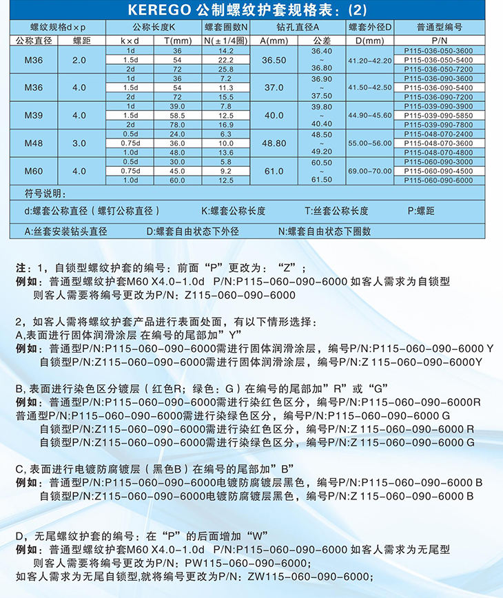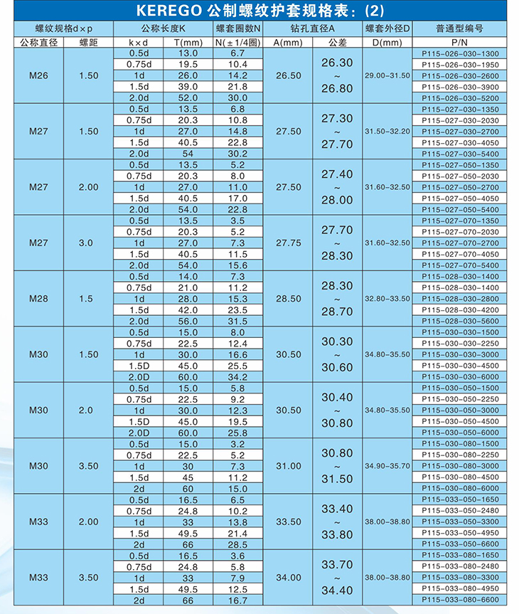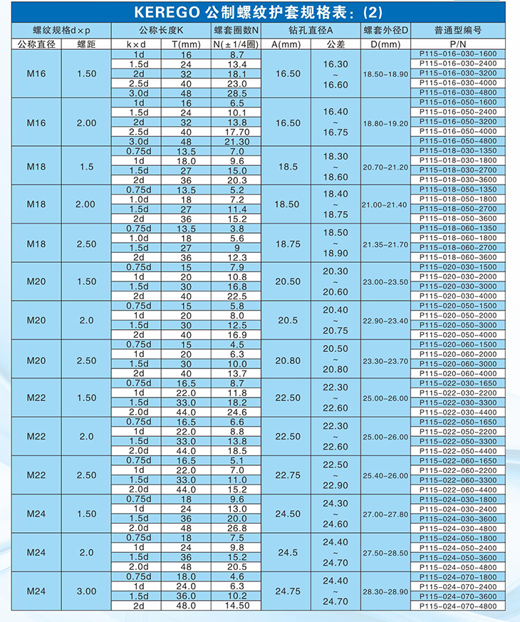 KEREGO 美制(UNF细纹)螺纹护套规格表:(1)
