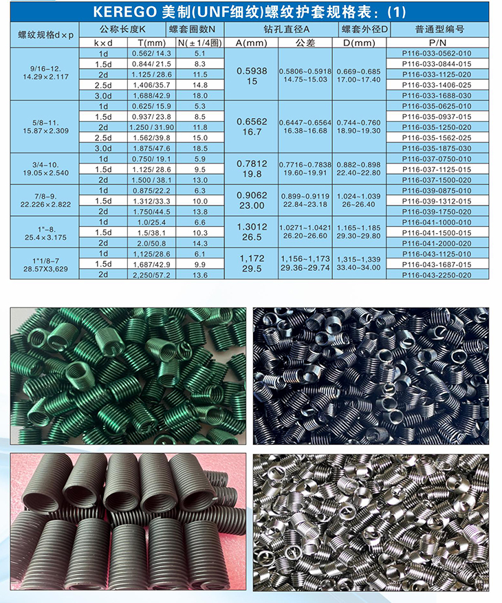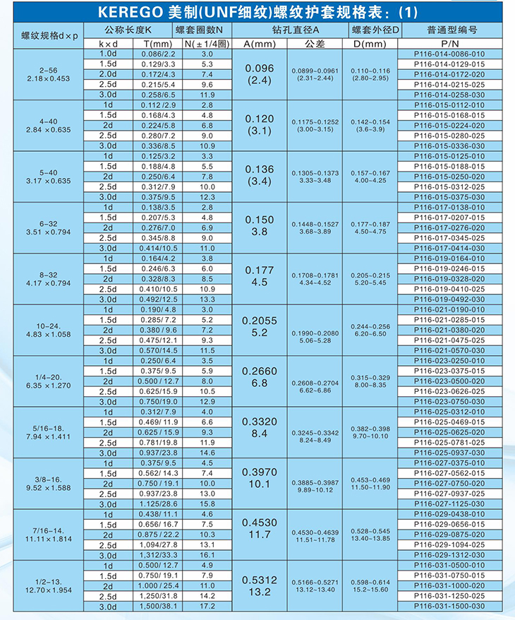KEREGO 美制(UNF细纹)螺纹护套规格表:(1)