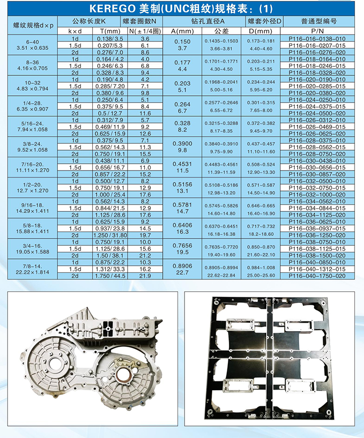KEREGO 美制(UNF细纹)螺纹护套规格表:(1)