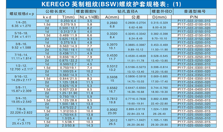 KEREGO 英制粗纹(BSW)螺纹护套规格表:(1)