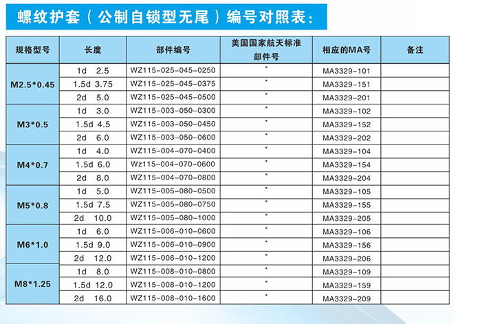 KEREGO 美制(UNF细纹)螺纹护套规格表:(1)