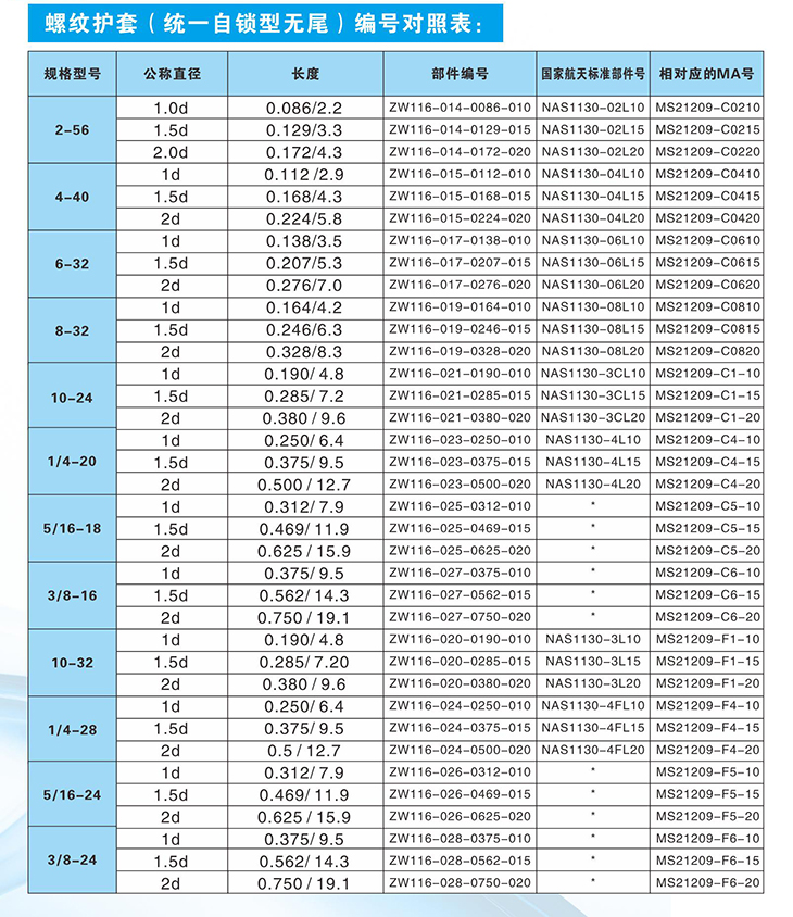 螺纹护套(统一自锁型无尾)编号对照表